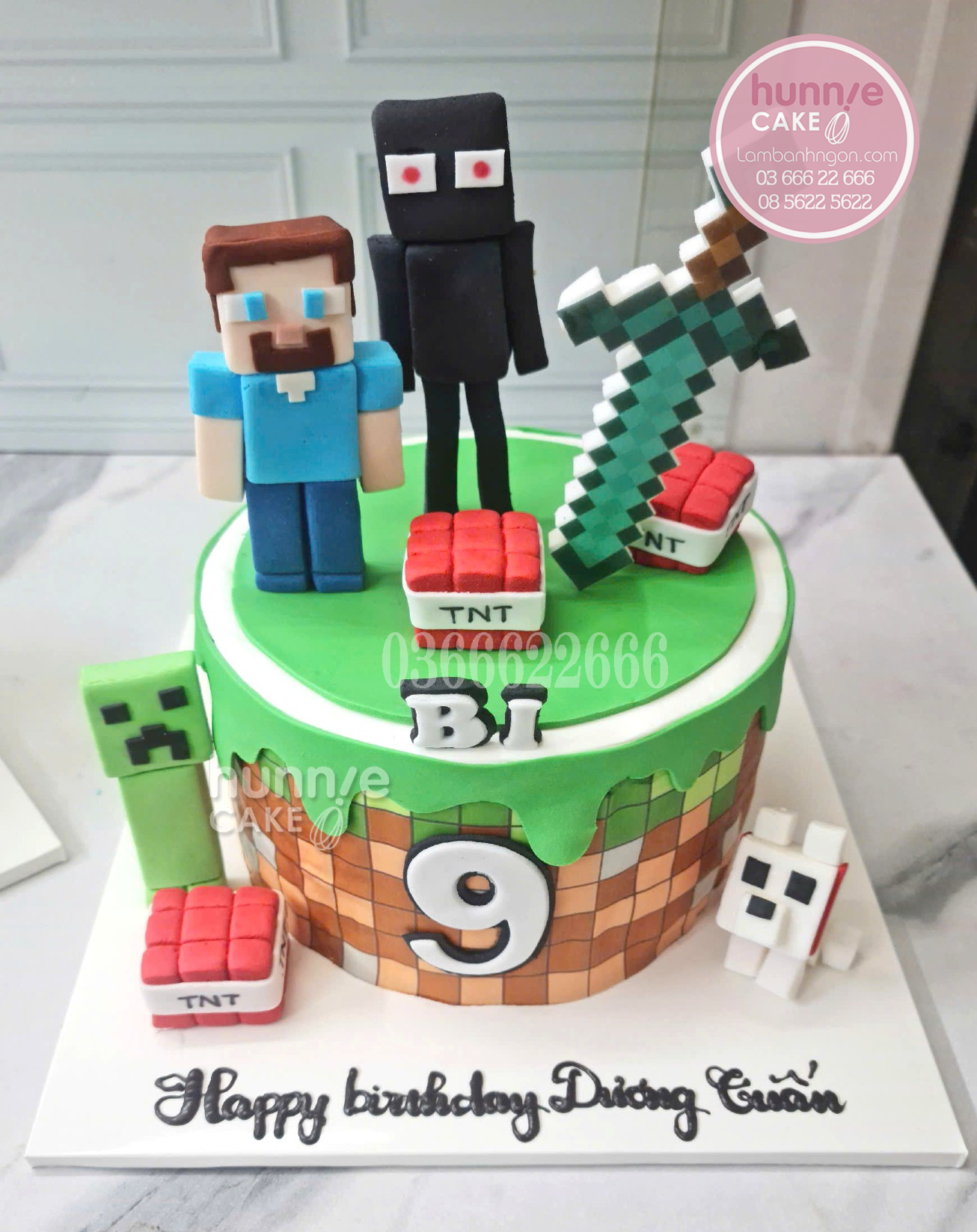 Chiếc bánh được thiết kế hoàn hảo để tái hiện thế giới hình khối của Minecraft. Mọi chi tiết, từ các khối gạch ở chân bánh đến các mô hình nhân vật Steve, Enderman và Creeper, đều được tạo hình tỉ mỉ, sắc nét. Thanh kiếm kim cương trên đỉnh bánh không chỉ đẹp mắt mà còn là biểu tượng của tinh thần chiến binh dũng cảm. Tên bé và con số 9 được đặt nổi bật, khẳng định dấu ấn cá nhân và cột mốc sinh nhật quan trọng này. Bánh sử dụng màu sắc tươi sáng, năng động, rất phù hợp với cá tính của bé trai.
