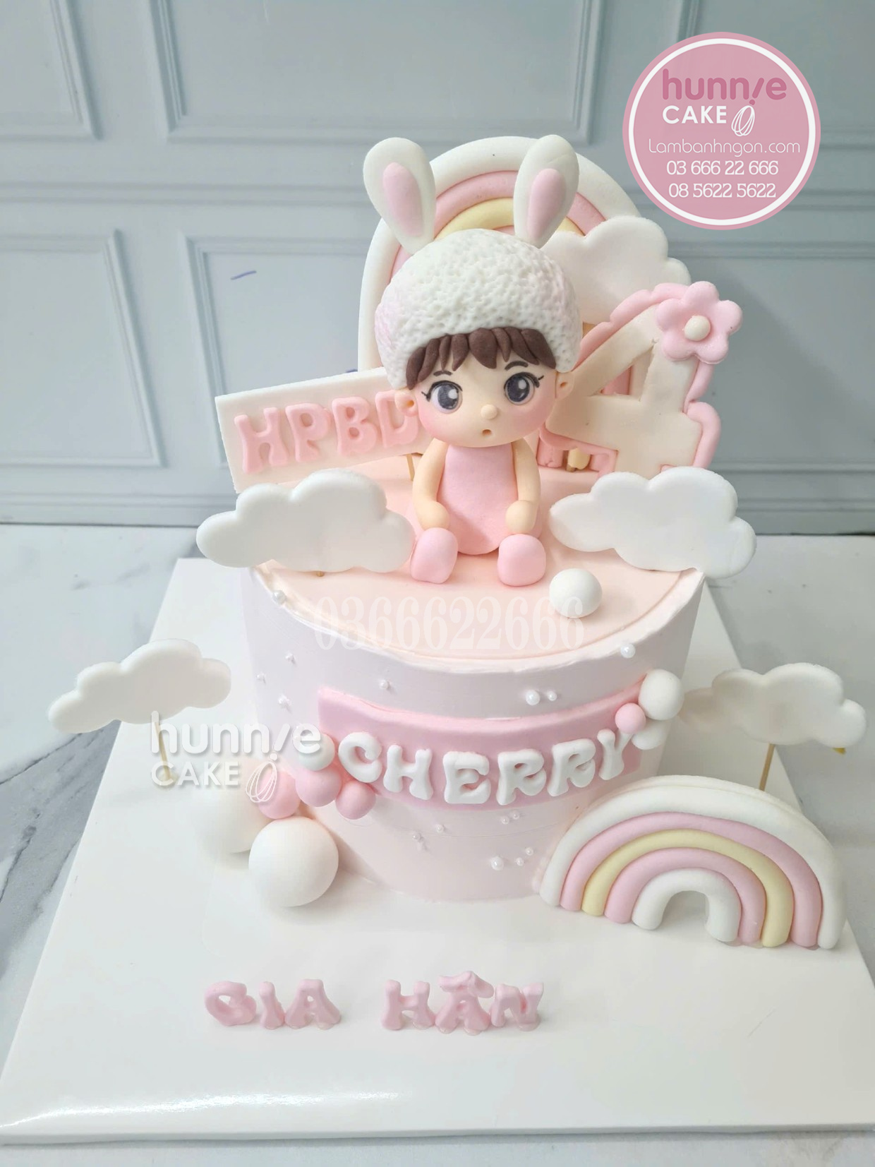 Từ khóa dài: Bánh sinh nhật bé gái 4 tuổi cầu vồng và thỏ xinh Hunnie Cake, địa chỉ mua bánh kem thỏ hồng uy tín cho bé tại Hà Nội.