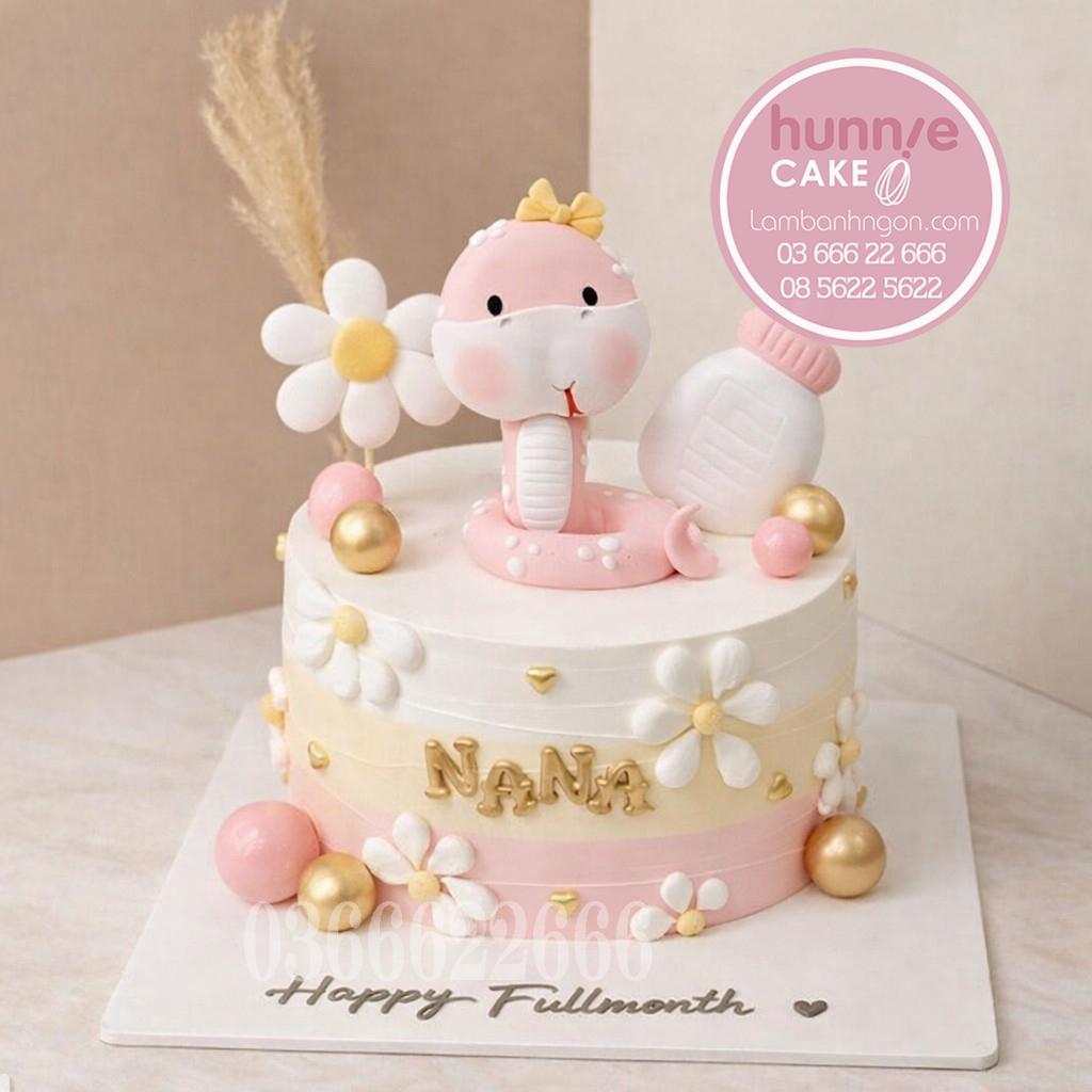Chi tiết thiết kế ấn tượng: Chú rắn hồng fondant, hoa trắng trang trí bánh, bình sữa nhỏ xinh, phối màu hồng trắng pastel, chữ nổi màu vàng kim.