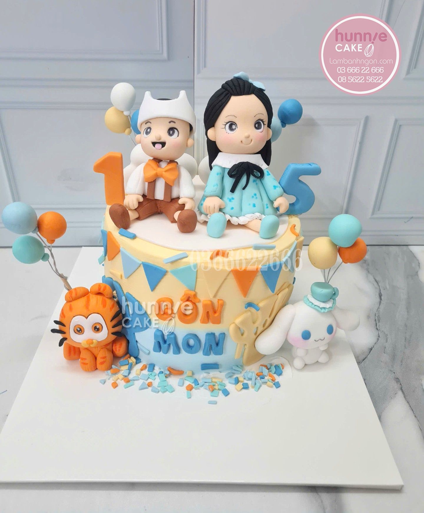 Việc tổ chức sinh nhật chung cho các con có ngày sinh gần nhau đang là lựa chọn thông minh của nhiều bà mẹ hiện đại. Hiểu được mong muốn tạo nên sự công bằng và niềm vui trọn vẹn cho cả hai con, Hunnie Cake mang đến mẫu bánh sinh nhật đôi thiết kế riêng cho bé trai 1 tuổi và chị gái 5 tuổi.