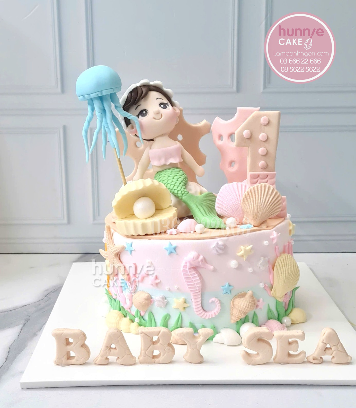 Bánh sinh nhật tạo hình nàng tiên cá kèm đuôi cá sao biển vỏ sò biển đại dương tặng bé gái 1 tuổi Hunnie cake, địa chỉ đặt bánh thôi nôi nàng tiên cá đẹp nhất, mẫu bánh kem đại dương cho bé gái 1 tuổi.