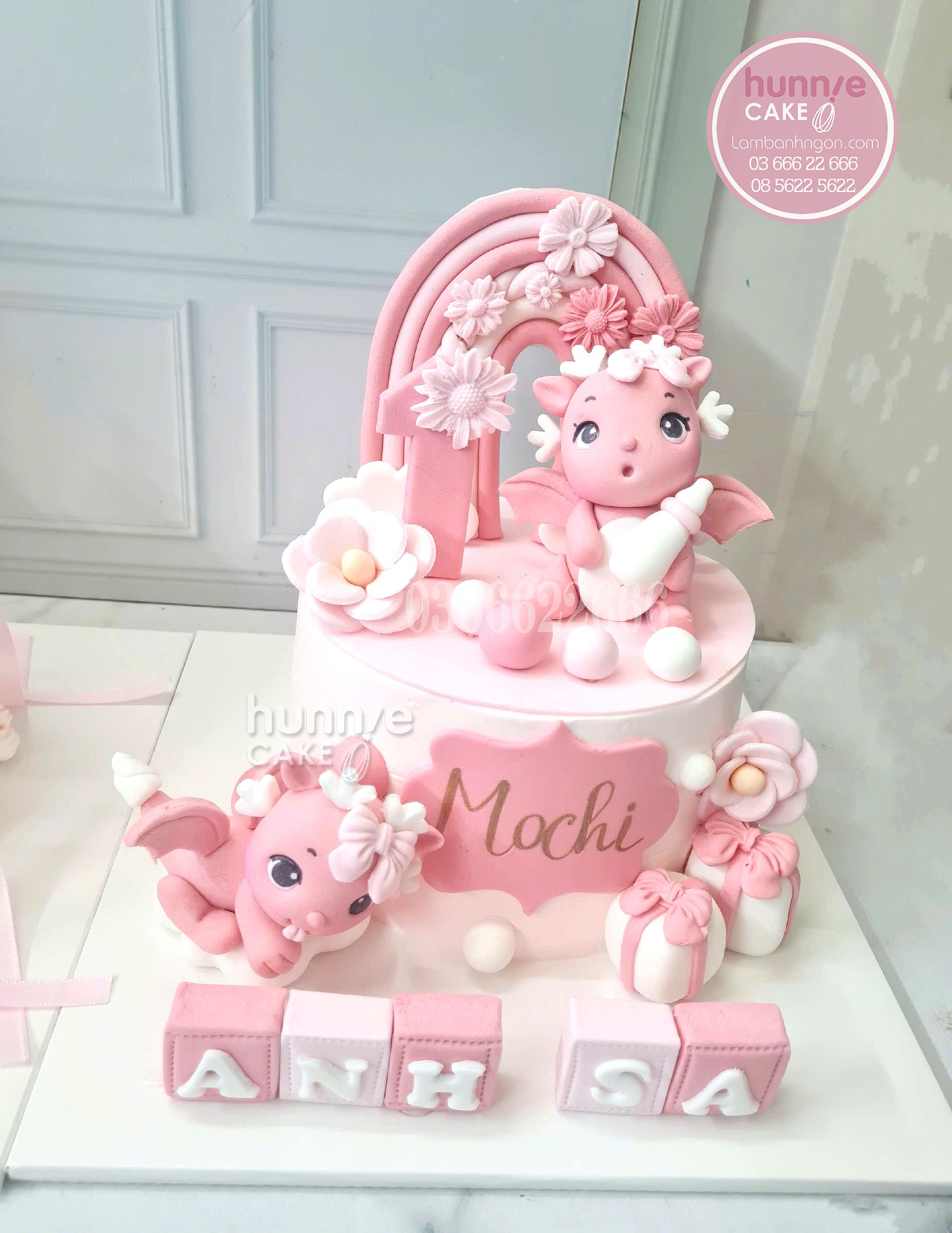 Bánh rồng hồng cầm bình sữa, bánh sinh nhật cầu vồng hồng, bánh kem trang trí hoa cúc, bánh sinh nhật tên Anh Sa, bánh fondant rồng con.