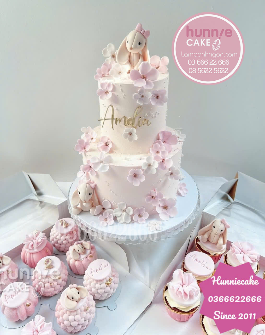Thiết kế sử dụng tone hồng pastel chủ đạo, kết hợp cùng các chi tiết hoa và tạo hình đáng yêu như thỏ, mang lại tổng thể hài hòa và sang trọng. Bánh chính cùng các bánh phụ được thiết kế đồng bộ, giúp bàn tiệc trở nên chuyên nghiệp và đẹp mắt.