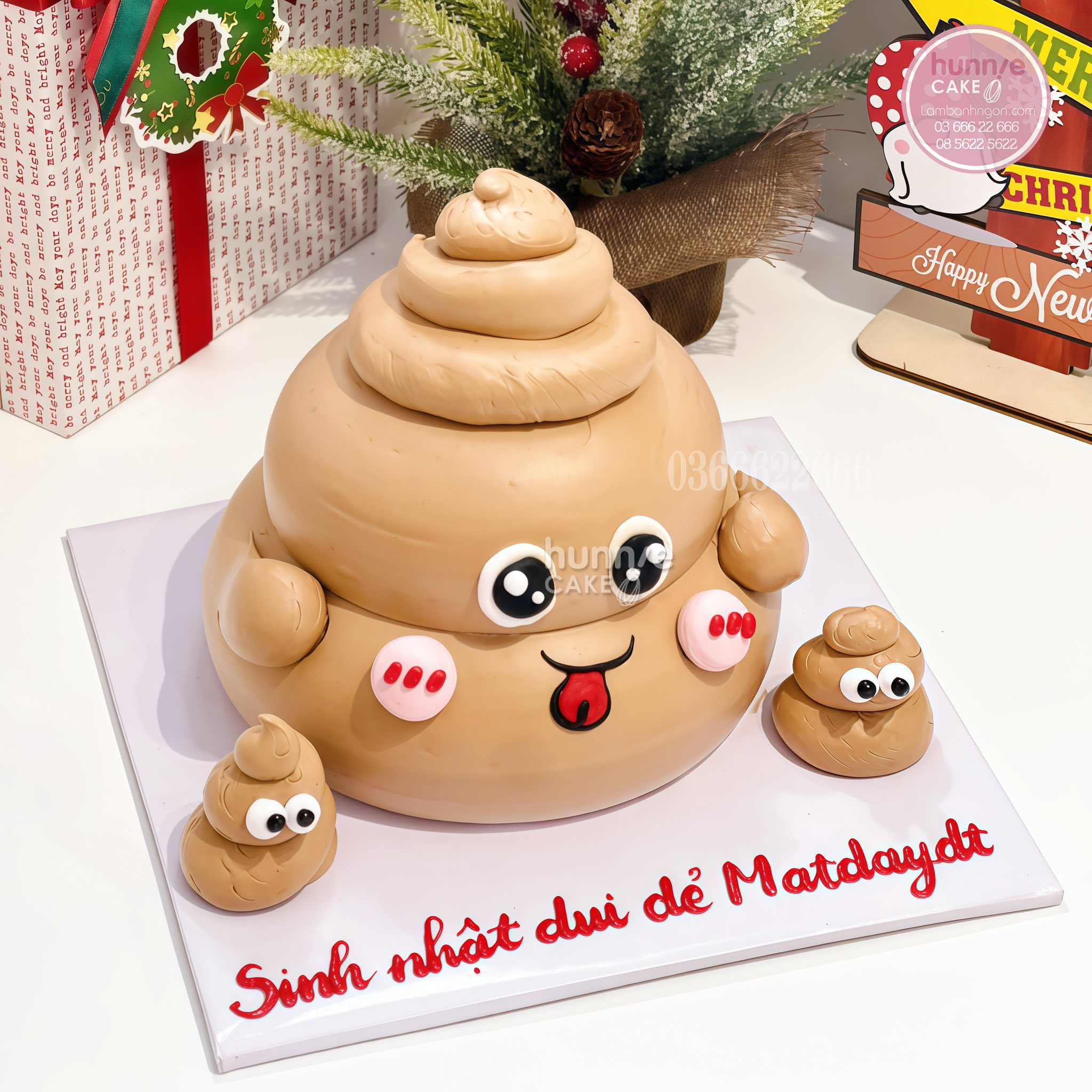 Tạo hình 3D Khổng lồ: Bánh hình Biểu tượng Phân (Poo Emoji) được nặn khối tròn đầy đặn, chân tay nhỏ xinh, mang lại cảm giác ngộ nghĩnh, hài hước.