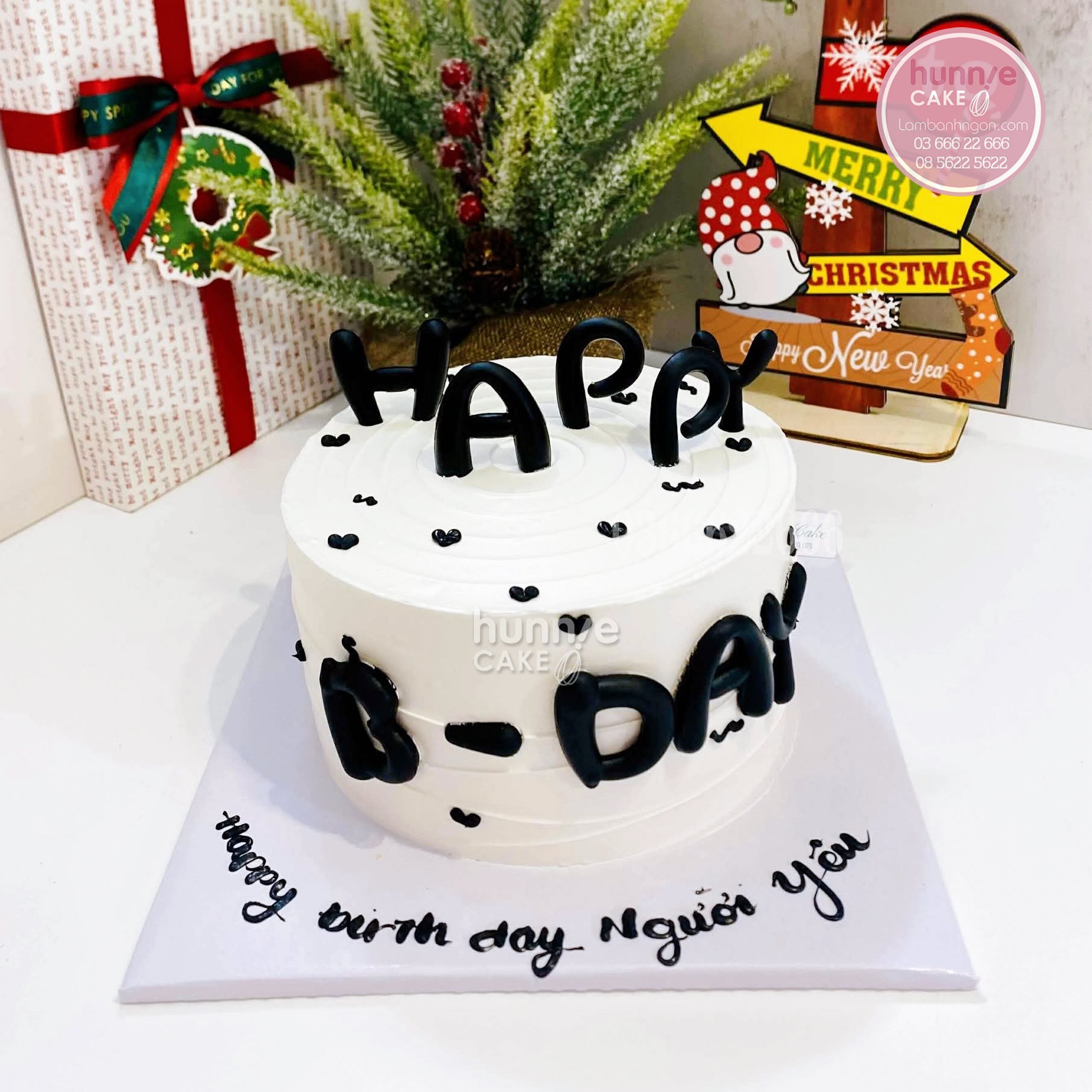 Chiếc bánh kem HAPPY B-DAY từ Hunnie Cake mang phong cách tối giản (minimalist) hiện đại, rất được lòng những người yêu thích sự thanh lịch và sang trọng.