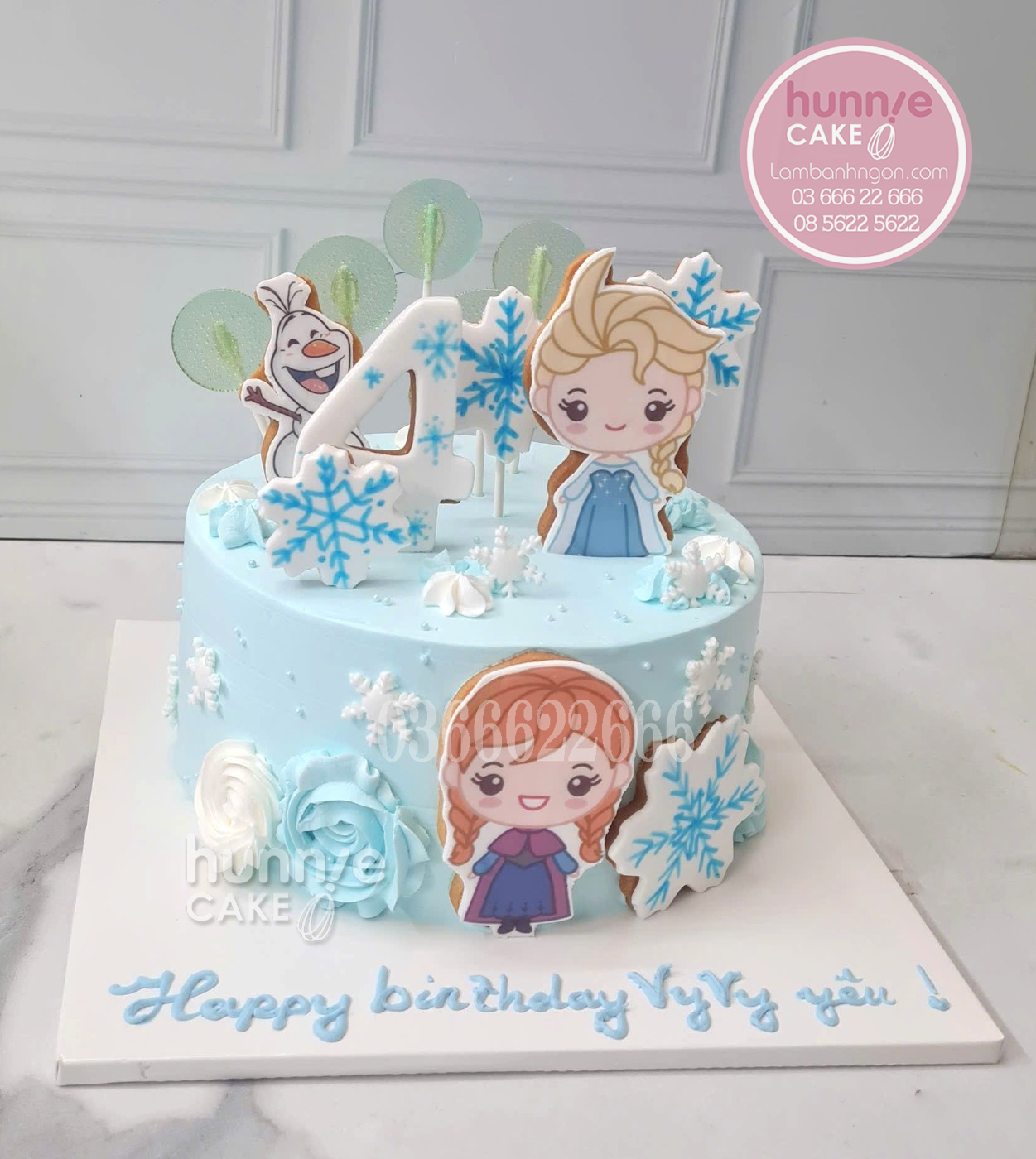 Chiếc bánh không chỉ là món quà, mà là một câu chuyện cổ tích sống động được viết trên nền kem mịn màng. Trên đỉnh bánh là sự hiện diện của chị em Elsa, Anna và người bạn Olaf vui nhộn, tất cả được thể hiện qua những nét vẽ chibi cực kỳ đáng yêu. Những bông tuyết trắng tinh khôi điểm xuyết cùng các viên kẹo lollipop trong suốt như pha lê tạo nên một không gian kỳ ảo. Dòng chữ Happy Birthday được viết nắn nót dưới chân bánh như lời thủ thỉ yêu thương mà ba mẹ dành cho nàng công chúa nhỏ của mình trong ngày tròn tuổi mới.