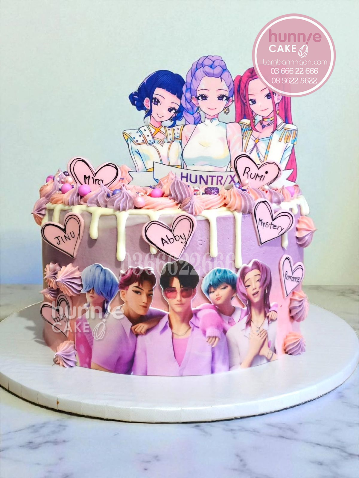 Từ khóa theo hình dáng và chi tiết: Bánh kem KPop Demon Hunters, bánh sinh nhật HUNTR/X, bánh kem hình idol K-pop, bánh kem in hình 3D, bánh sinh nhật màu tím hồng.