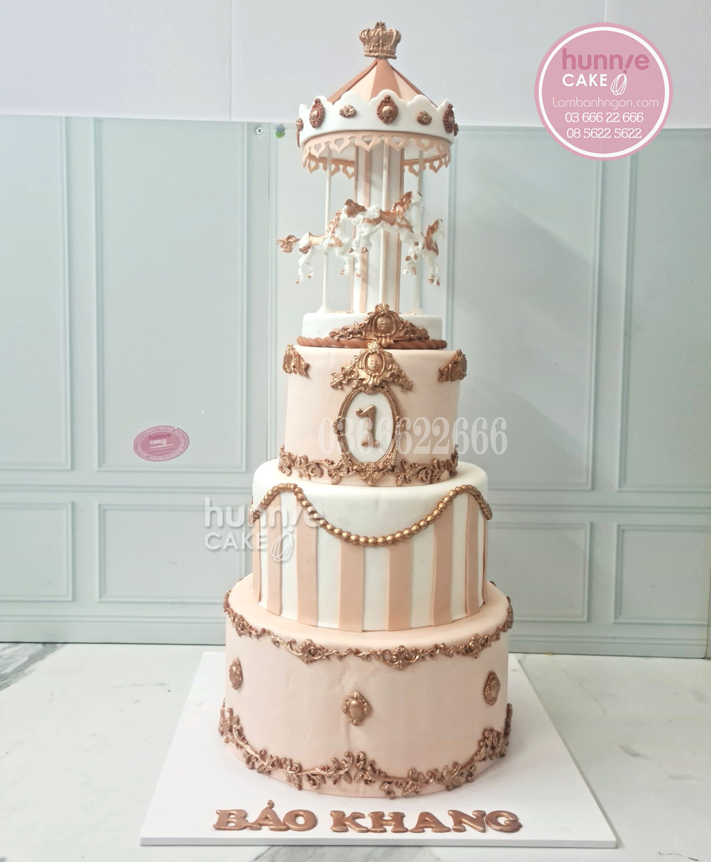 Chiếc bánh được tạo hình nhiều tầng, phía trên là mô hình vòng quay ngựa gỗ tinh xảo. Các chi tiết trang trí được làm thủ công tỉ mỉ từ fondant, kết hợp gam màu nâu pastel và ánh vàng đồng sang trọng. Tổng thể chiếc bánh vừa mang nét cổ tích, vừa thể hiện gu thẩm mỹ cao cấp, phù hợp với những buổi tiệc được đầu tư chỉn chu.
