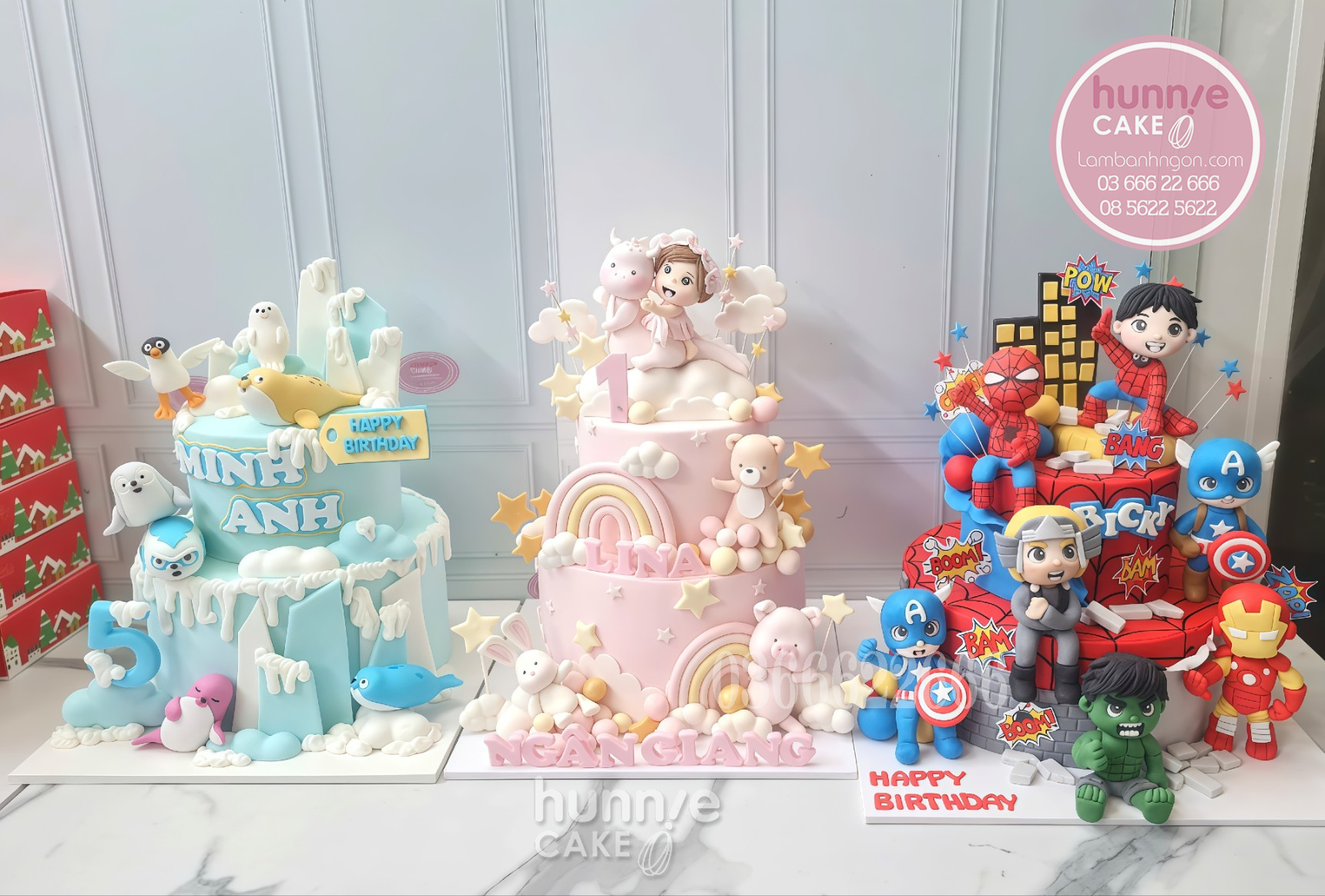 Trong thế giới bánh ngọt hiện đại, bánh fondant (bánh đường dẻo) đã trở thành xu hướng hàng đầu nhờ khả năng tạo hình không giới hạn và độ bền cao trong suốt buổi tiệc. Tại Hunnie Cake, chúng tôi tự hào mang đến hệ sinh thái bánh sinh nhật đa dạng, từ những mẫu bánh chủ đề đại dương xanh mát với những chú hải cẩu vui nhộn cho đến thế giới đa vũ trụ của các siêu anh hùng mạnh mẽ.